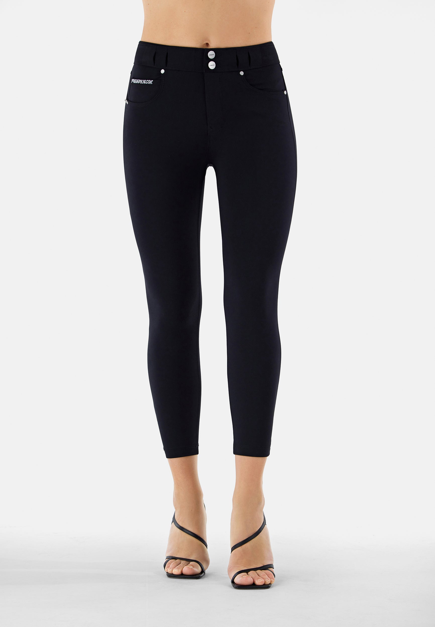 N.O.W.® D.I.W.O.® Pro redefines comfort without compromise. This true-to-size, high-waisted 7/8 length pant features our proprietary Emana® fabric—engineered with bioactive minerals that work with friction and UV rays to visibly reduce cellulite appearance and enhance skin firmness. The sleek silhouette mimics a traditional skinny leg trouser while delivering exceptional wearability. Real buttons, hidden belt loops, and five functional pockets complete the refined design. Black. 59% Polyamide, 41% Elastane.