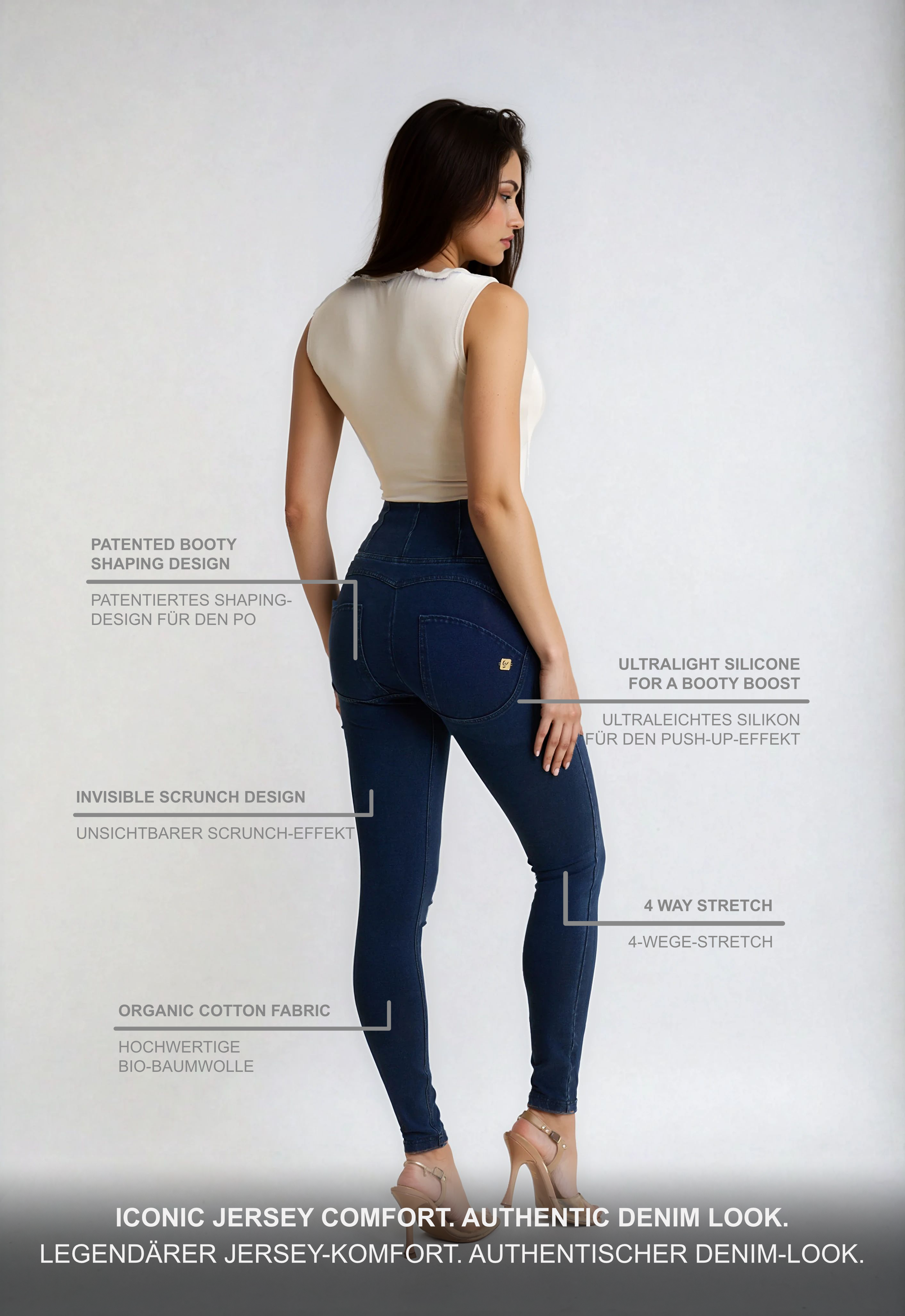 Spodnie WR.UP® w kolorze niebieskim: zaprojektowane, aby podkreślać sylwetkę i poruszać się razem z Tobą. Łączą w sobie ponadczasową długość pełną, idealną na każdą porę roku. Dodatkowo mają pochlebny wysoki stan, który oferuje delikatne wsparcie. Całość dopełnia smukły krój skinny, który otula Twoje krągłości. Wykonane z połączenia ponadczasowej estetyki denimu z ulepszonym komfortem i elastycznością. Jako część linii WR.UP® posiadają opatentowaną technologię zaprojektowaną, aby naturalnie podkreślać i modelować Twoją sylwetkę. Idealne na niezliczone okazje, od casualowych po eleganckie.