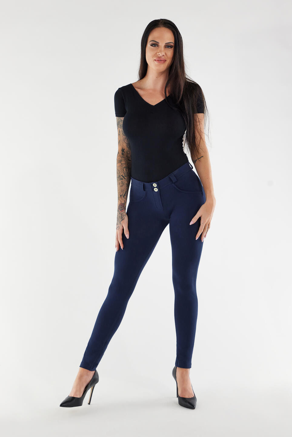 Die Mid-Waist-Modelle sitzen zwischen der Taille und dem Bauchnabel. Alle unsere mittlere Jeans haben vorne drei Freddy-typische Knöpfe. Sie sind etwas höher als unsere Regular-Waist-Hosen, aber nicht ganz so hoch, wie die High-Waist-Modelle. Sie haben einen bequemen, hohen Bund ohne Silikonstreifen, und die Knöpfe sorgen für einen perfekten Sitz. Jeans in Mid Waist eignen sich vor allem für kurvigere Frauen, die mehr Stütze und Form für den Bauch und die Taille möchten. Zusätzlich zaubern die Hosen natürlich den perfekten Po.
