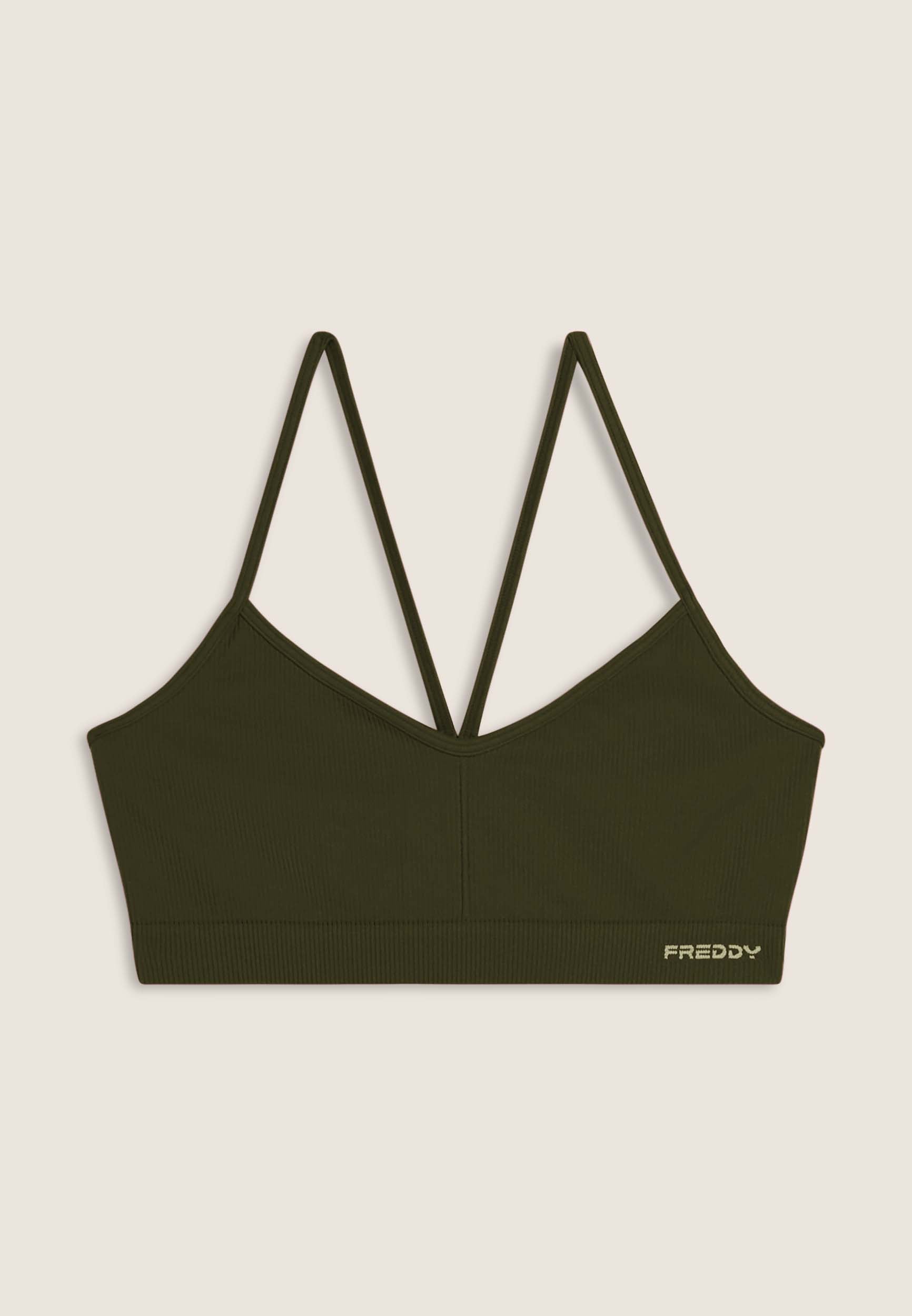 Medium support sports bra, ideal for variable intensity training. Made from seamless ribbed fabric, it seamlessly follows the contours of the body to provide total comfort. The design includes a wide neckline and thin shoulder straps crossed at the back, with a small FREDDY jacquard logo on the underbust band.