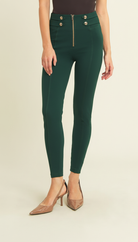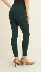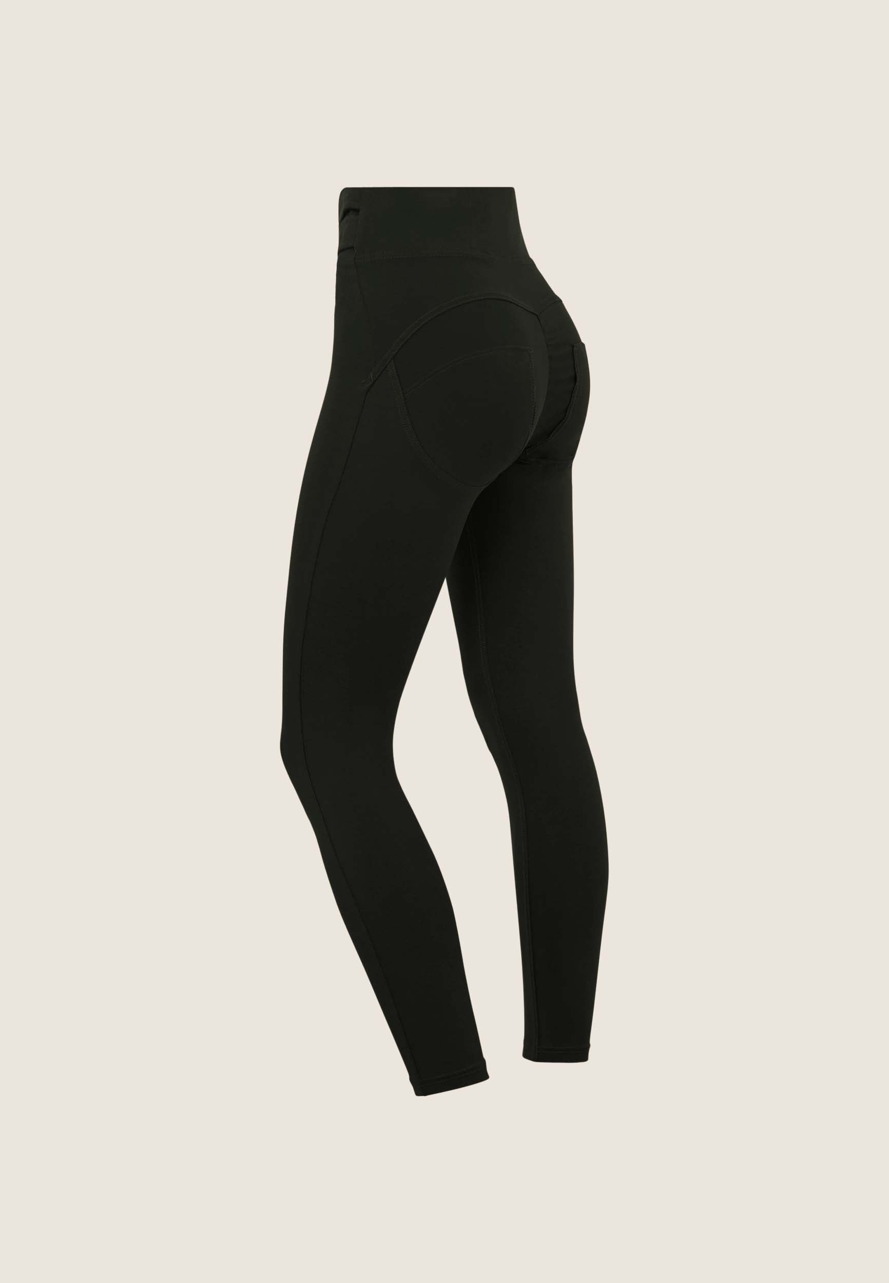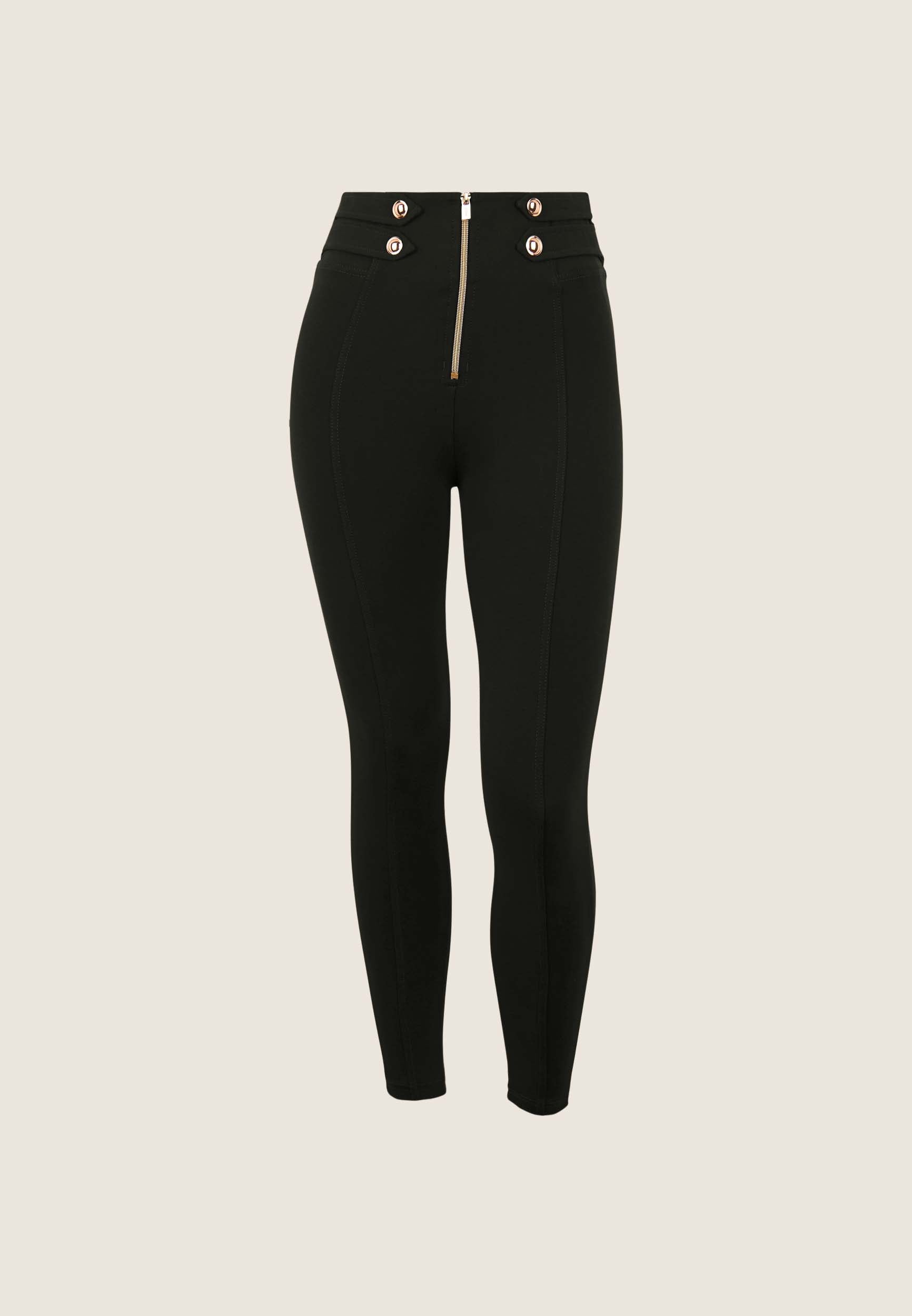 WR.UP® super skinny push-up 7/8 length trousers in heavy organic stretch cotton jersey. The decorative ribbons at the waist, fixed by large gold rivets, and the central stitching along the leg give the garment character and originality. High waist with central zip.