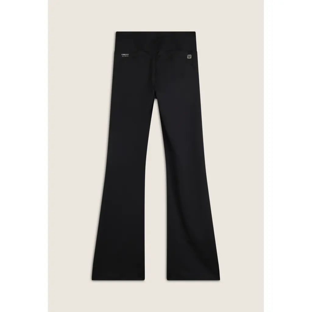 A touch of originality to your sportswear: these flare leggings are made of D.I.W.O. fabric with heavy stretch polyester, offering a perfect combination of breathability and durability. The two-tone crossed waistband adds a sophisticated detail that enhances the figure, while the glitter logo on the left front side adds a bright and elegant touch to your look.