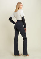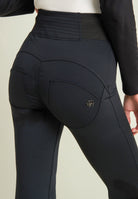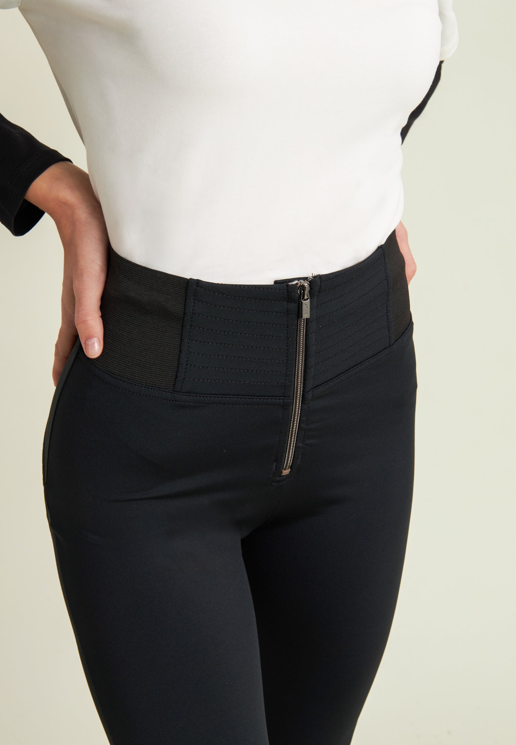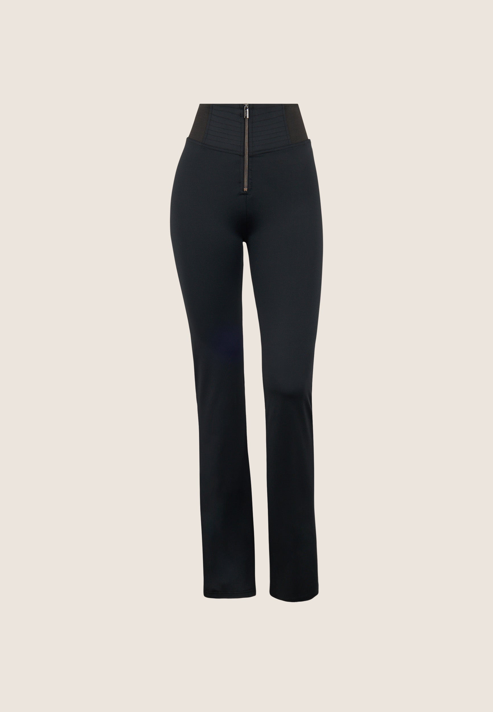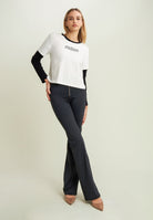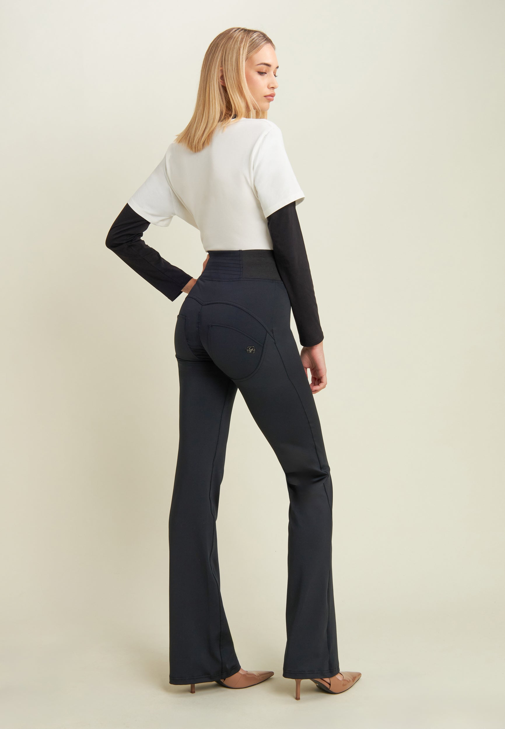 WR.UP® skinny push-up trousers with flared bottom made from breathable D.I.W.O.® performance fabric. The decorative stitching at the waist and the stretch jacquard side inserts enhance the silhouette with elegance. High waist with central zip.