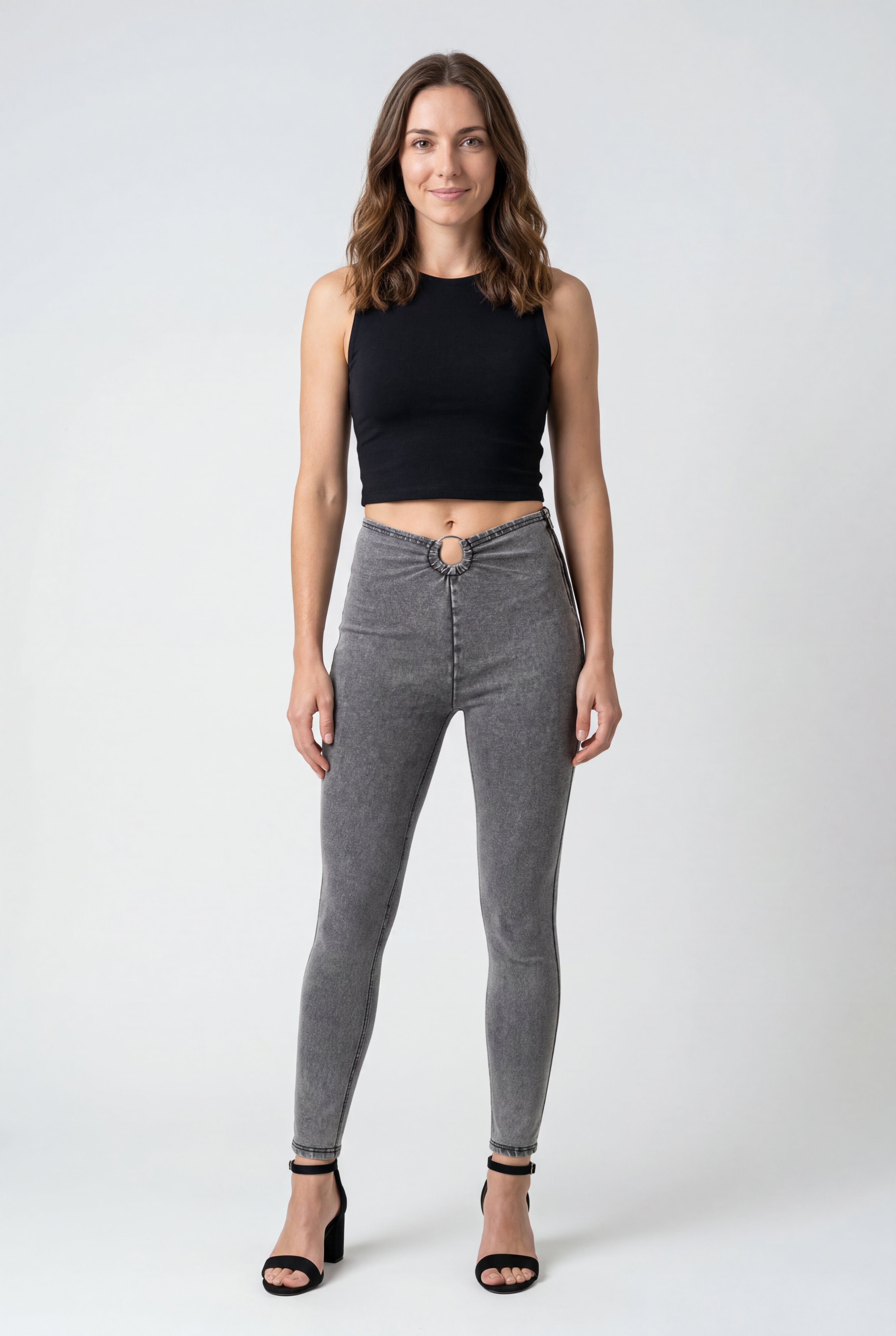 WR.UP Push-Up High Waist Skinny 7/8 Denim Jeans With Stud Ring Waist Band - Denim Gray - Black Seam
