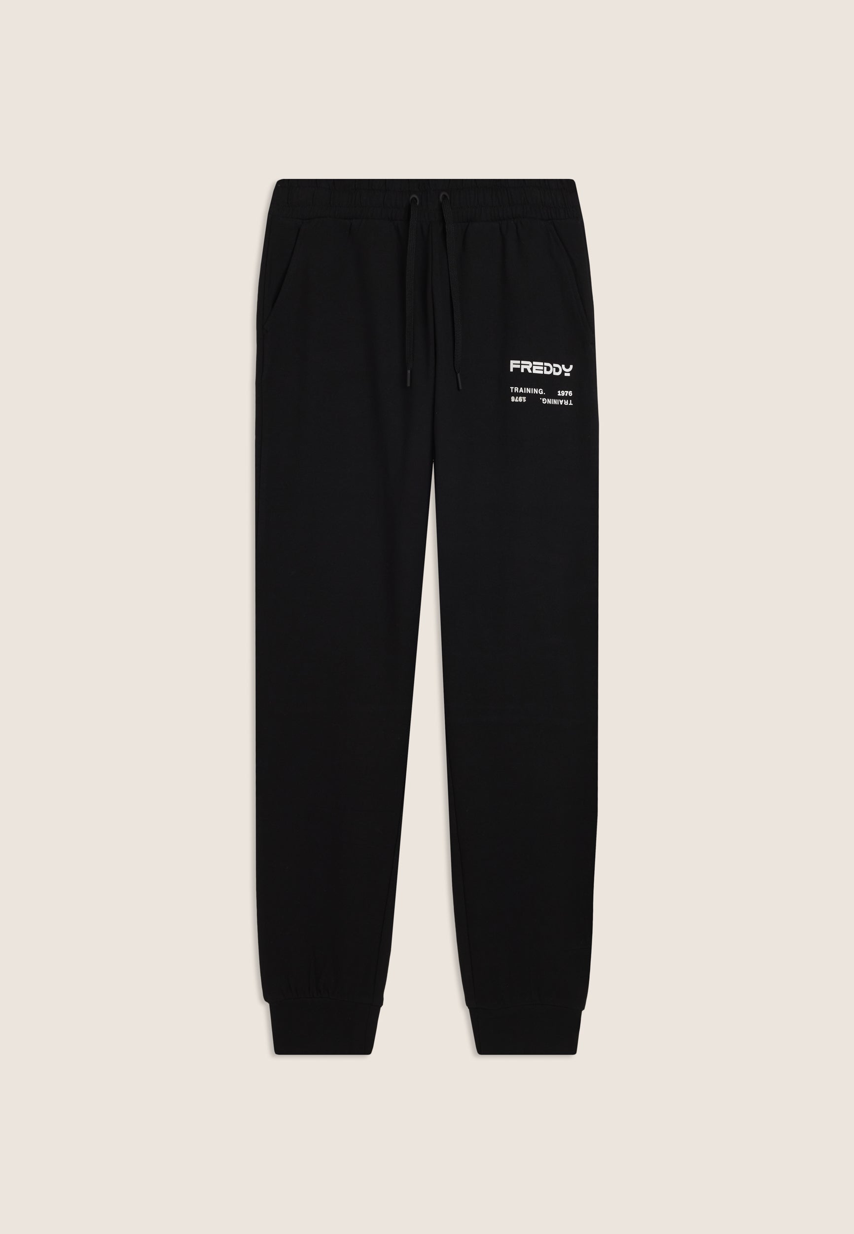 Men's athletic trousers in a regular fit and length, made of baby French Terry for maximum comfort. They feature a regular waist with inner elastic and drawstring for a customised fit, regular legs with panel stitching, and a ribbed cuff hem that enhances the line of the garment. Tone-on-tone side bands run from below the knee to the bottom of the leg, and the rubberised logo print on the left hip adds a distinctive, technical touch. Slant besom pockets and a back patch pocket complete the garment, ideal for everyday use and sports activities.