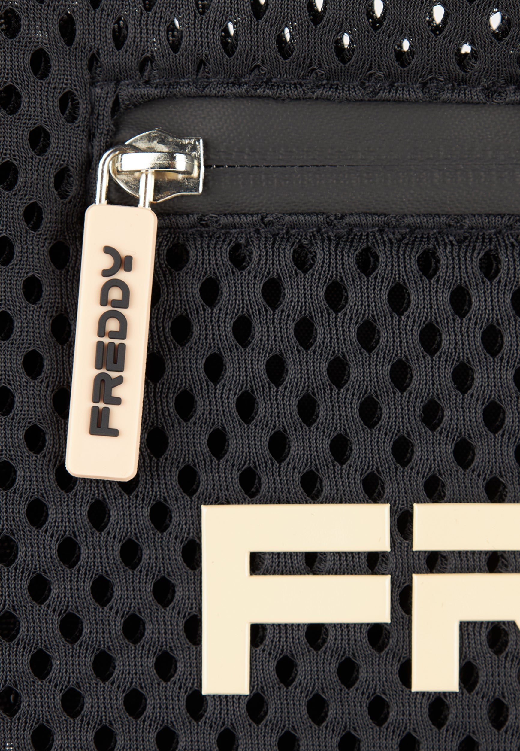 Lightweight, practical and sustainable, this black recycled polyester backpack bag is perfect for the gym and for leisure. The FREDDY logo on the outside gives it a distinctive touch, while the open-hole mesh ensures optimal ventilation. The double drawstring shoulder straps and handles offer versatility of transportation. The drawstring fastening makes access quick and convenient, while the front inside zip pocket means smaller items can be stored securely.