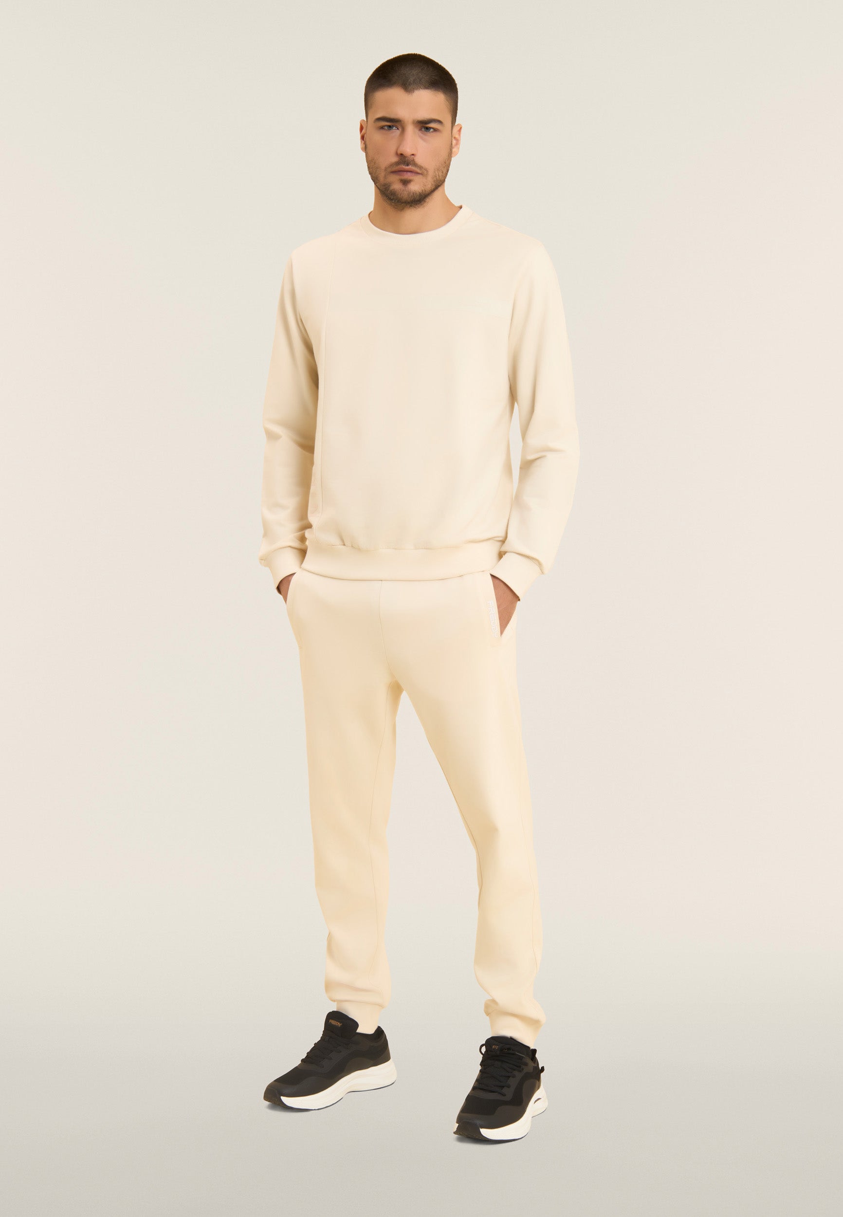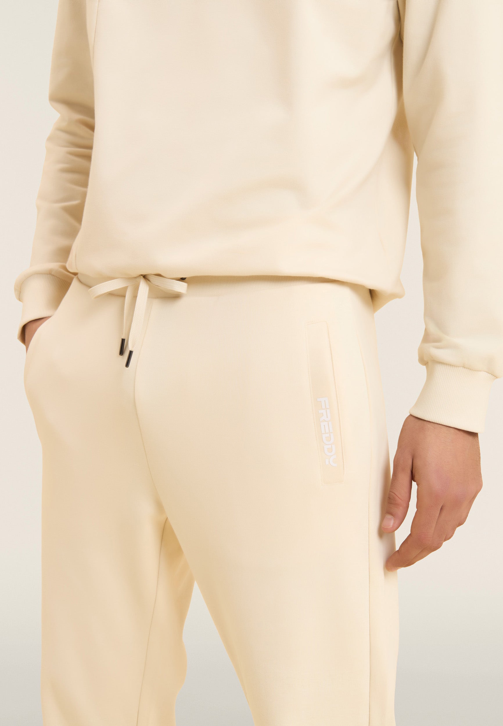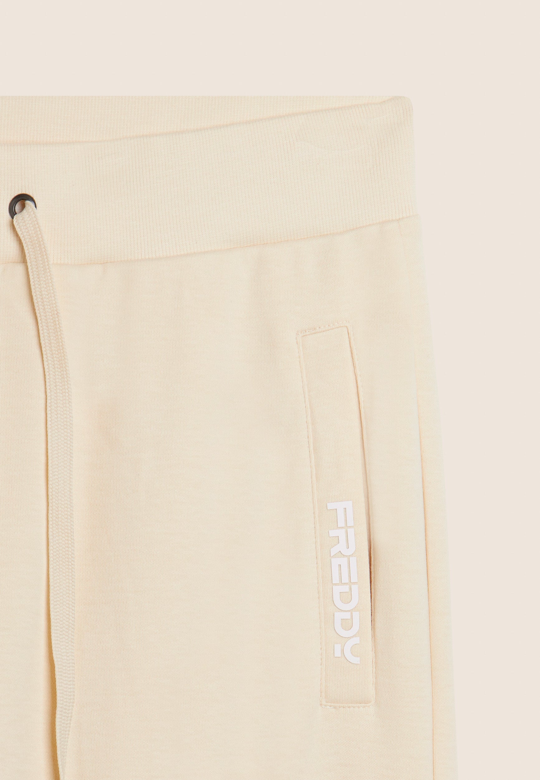 100% cotton interlock trousers with a cotton with a thick but soft feel, designed for everyday comfort. Regular fit, full length. Ribbed waistband with drawstring, regular leg with cuff bottom. Front besom pockets and right back pocket. The matt rubberised FREDDY logo print is positioned on the opening of the left pocket. Perfect for cross-use.