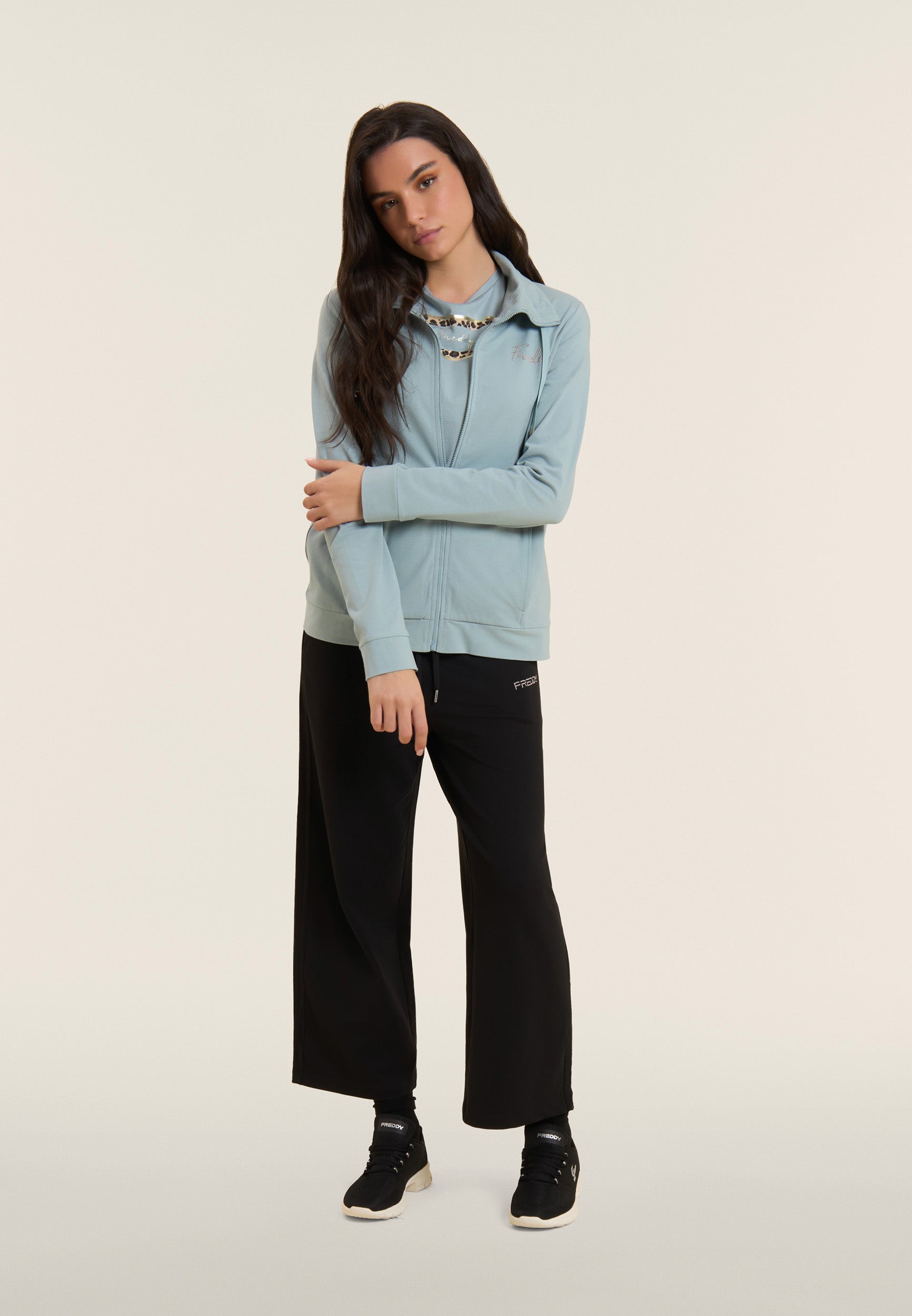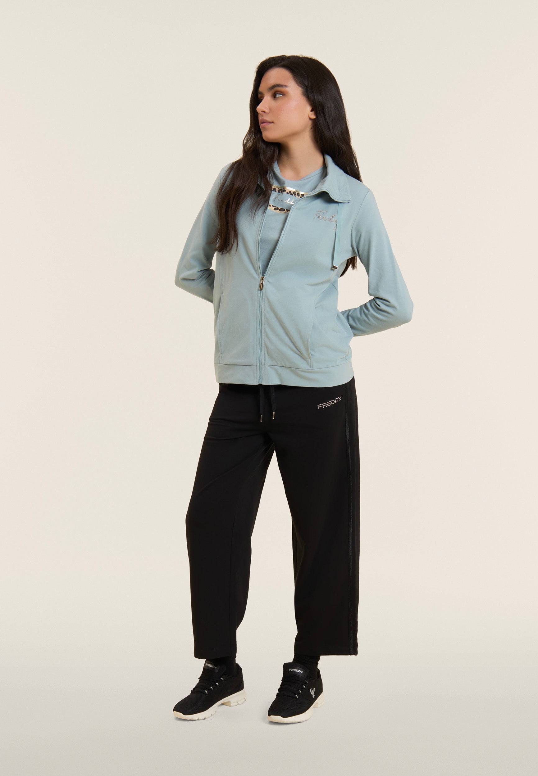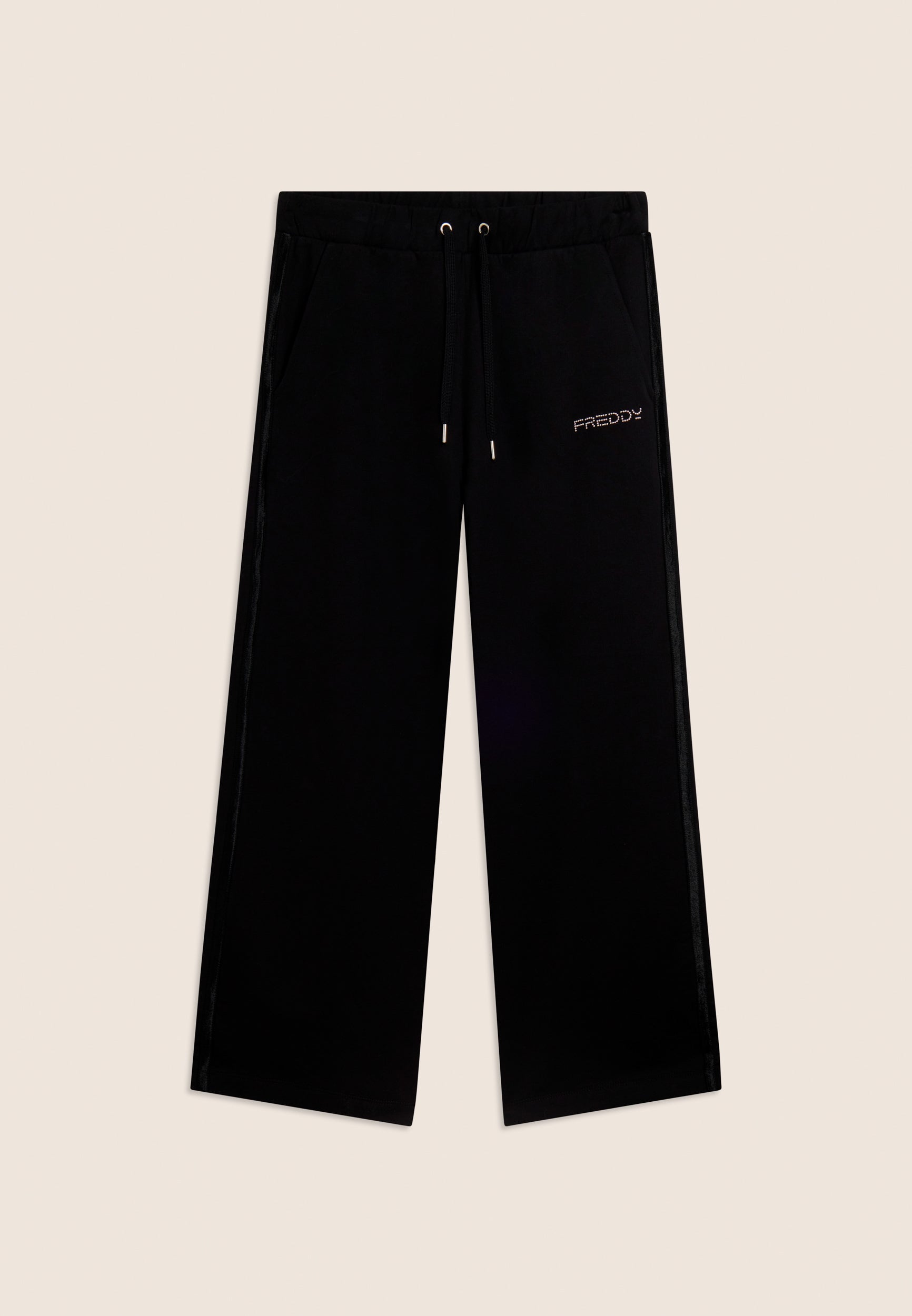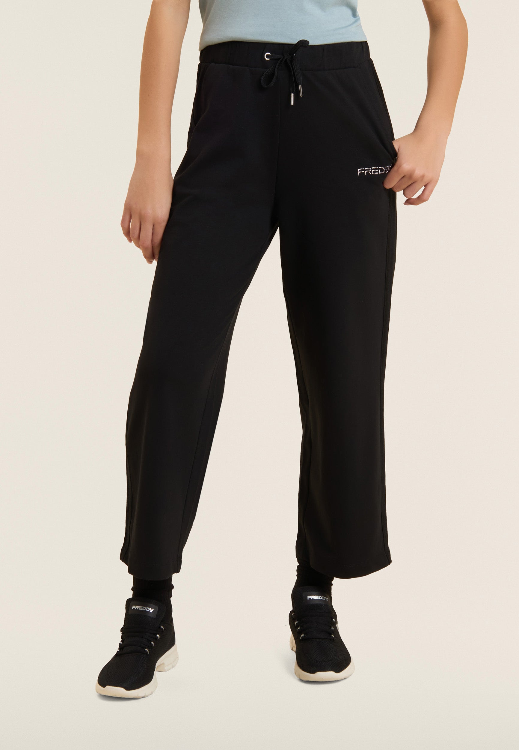 Athletic trousers with comfort fit, wide leg and cropped length, ideal for light activities and relaxing moments. The waist has internal elastic and is adjustable through the drawstring. The FREDDY logo in light pink beads on the heart and the shiny elastic inserts decorating the side seams add a touch of style. Made of heavy cotton stretch jersey, they offer maximum comfort.