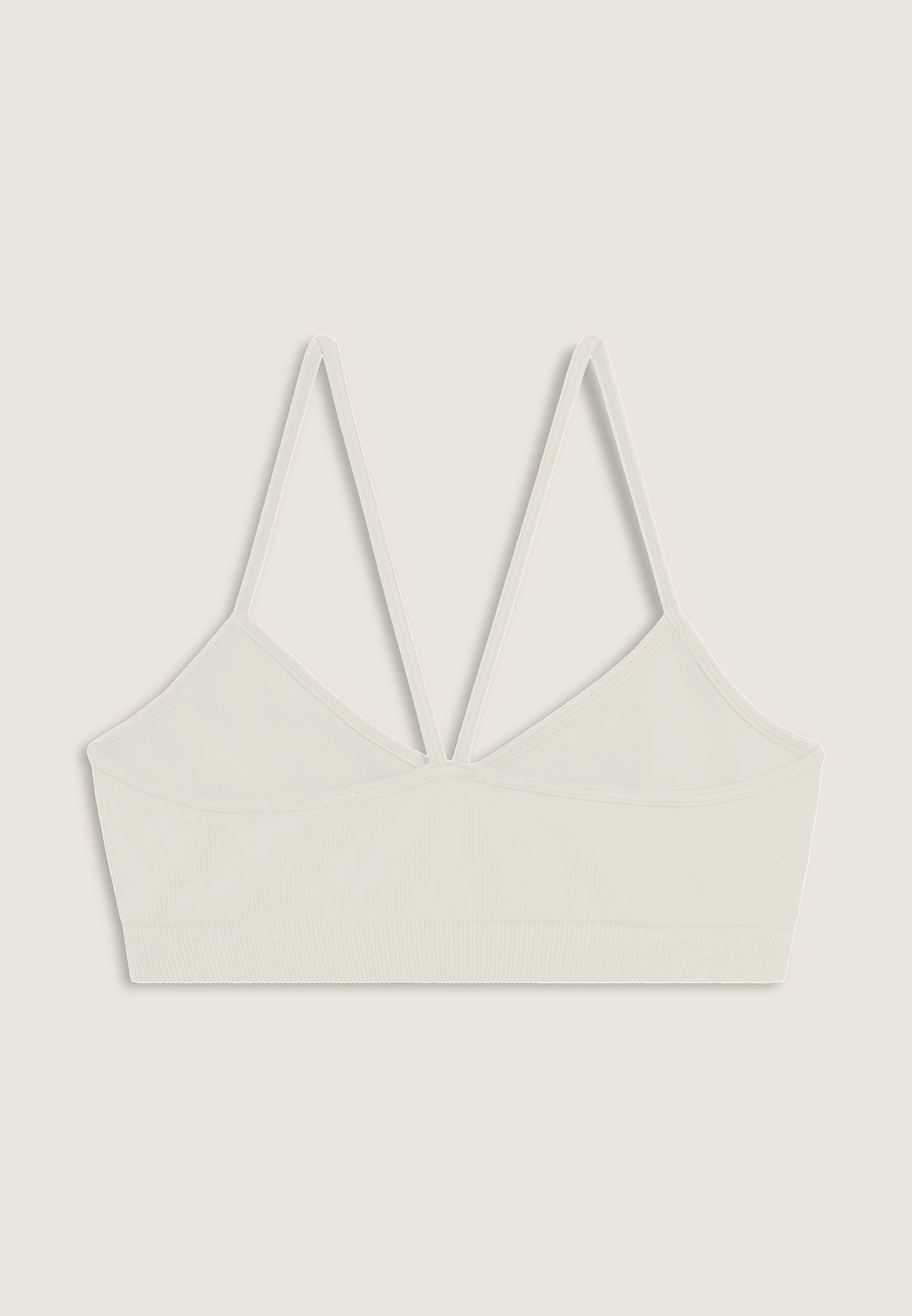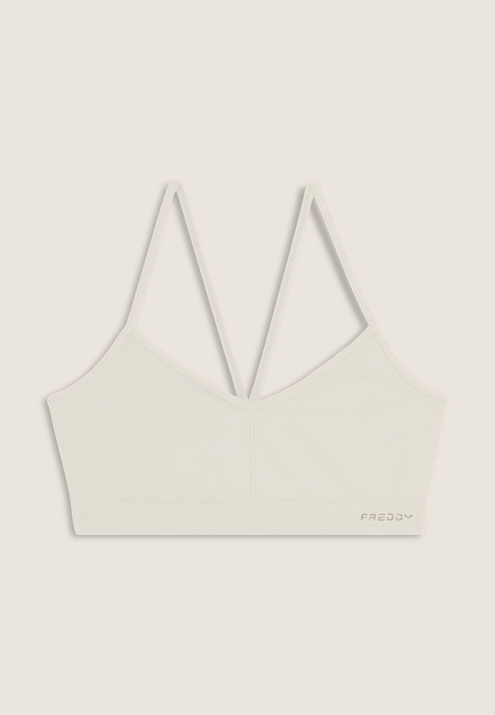 Medium support sports bra, ideal for variable intensity training. Made from seamless ribbed fabric, it seamlessly follows the contours of the body to provide total comfort. The design includes a wide neckline and thin shoulder straps crossed at the back, with a small FREDDY jacquard logo on the underbust band.