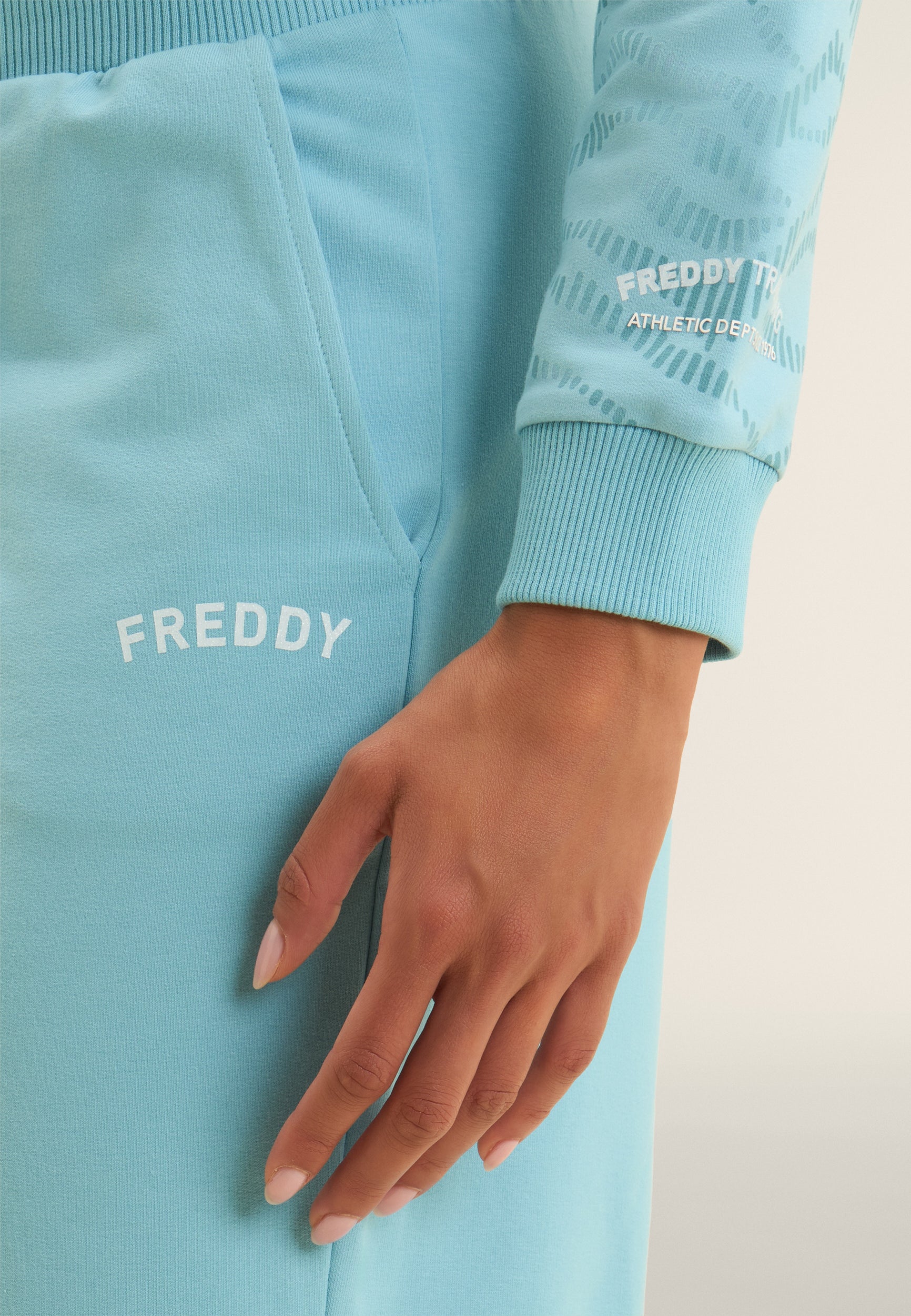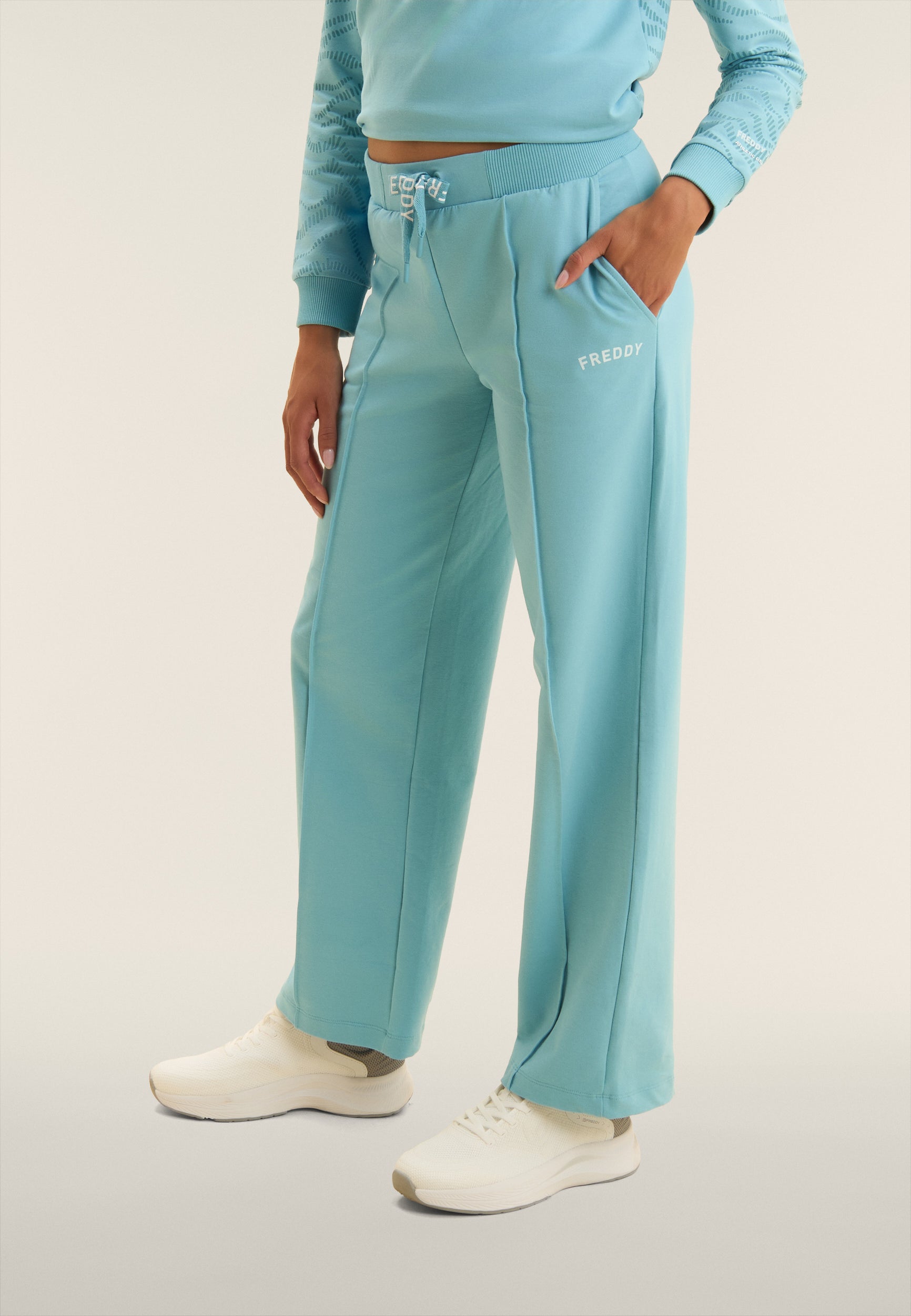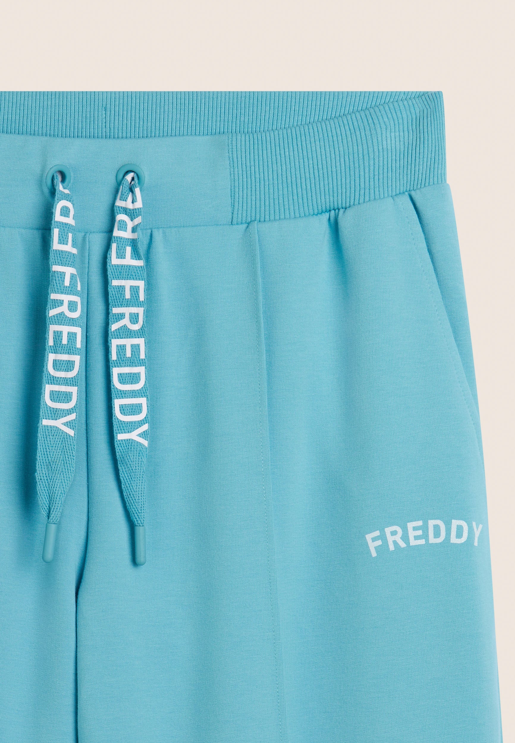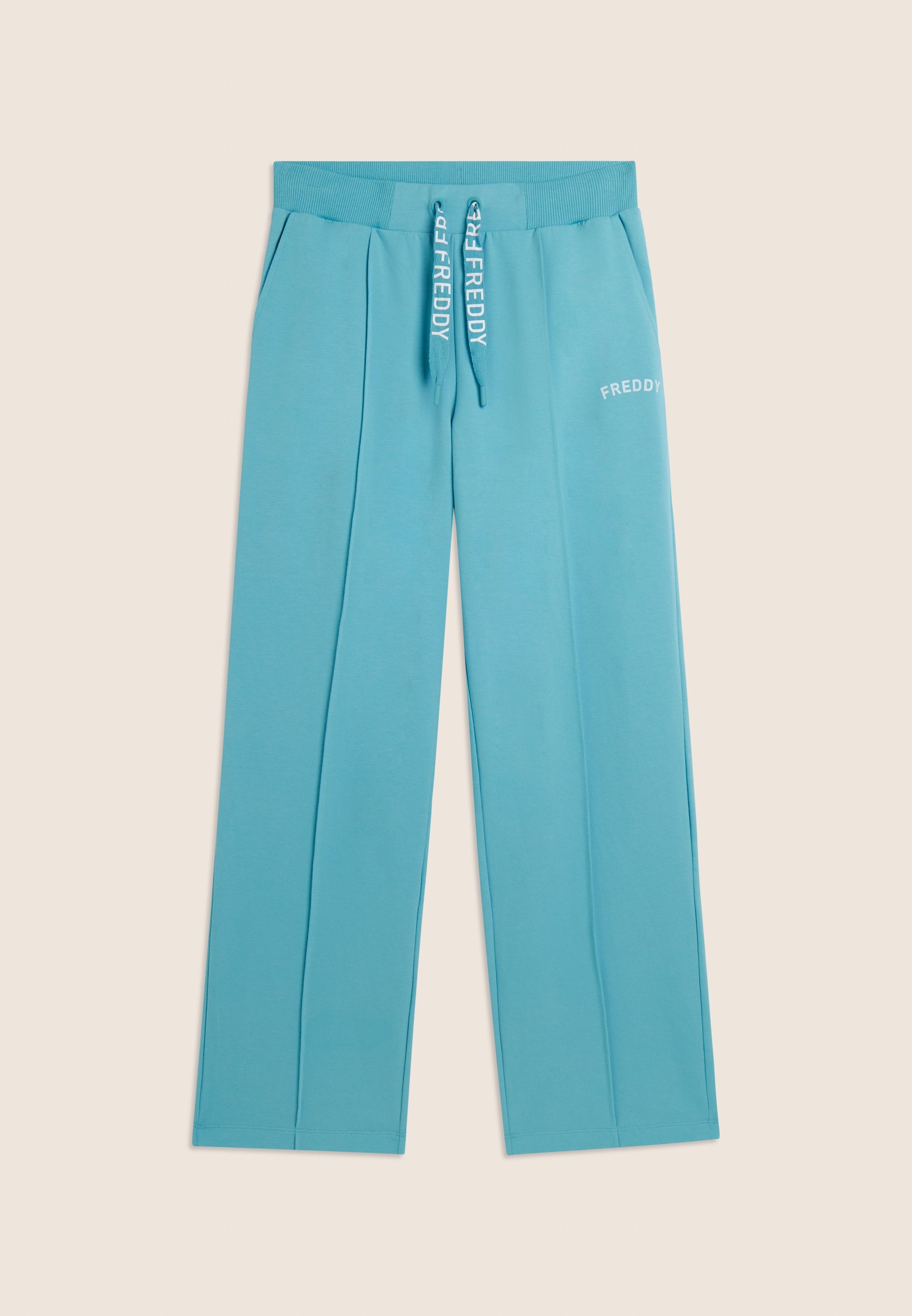 Wide-leg athletic trousers with straight bottom, regular waist and ribbed waistband with FREDDY logo drawstring. The loose, flowing cut enhances the figure without sacrificing comfort. The FREDDY logo in white glitter on the left side lends light and femininity. In stretch French terry, perfect for a relaxed, contemporary style.