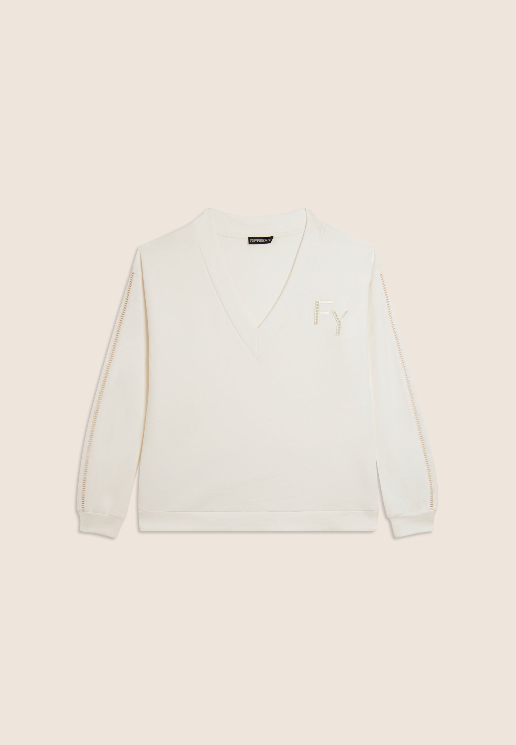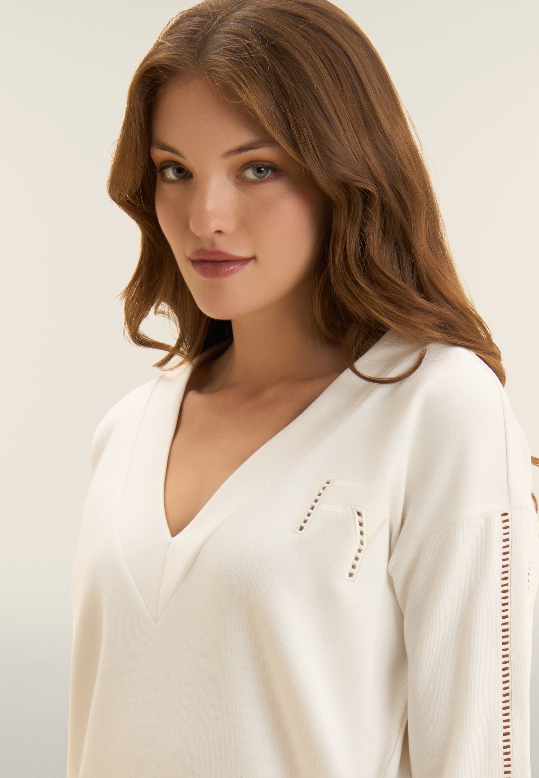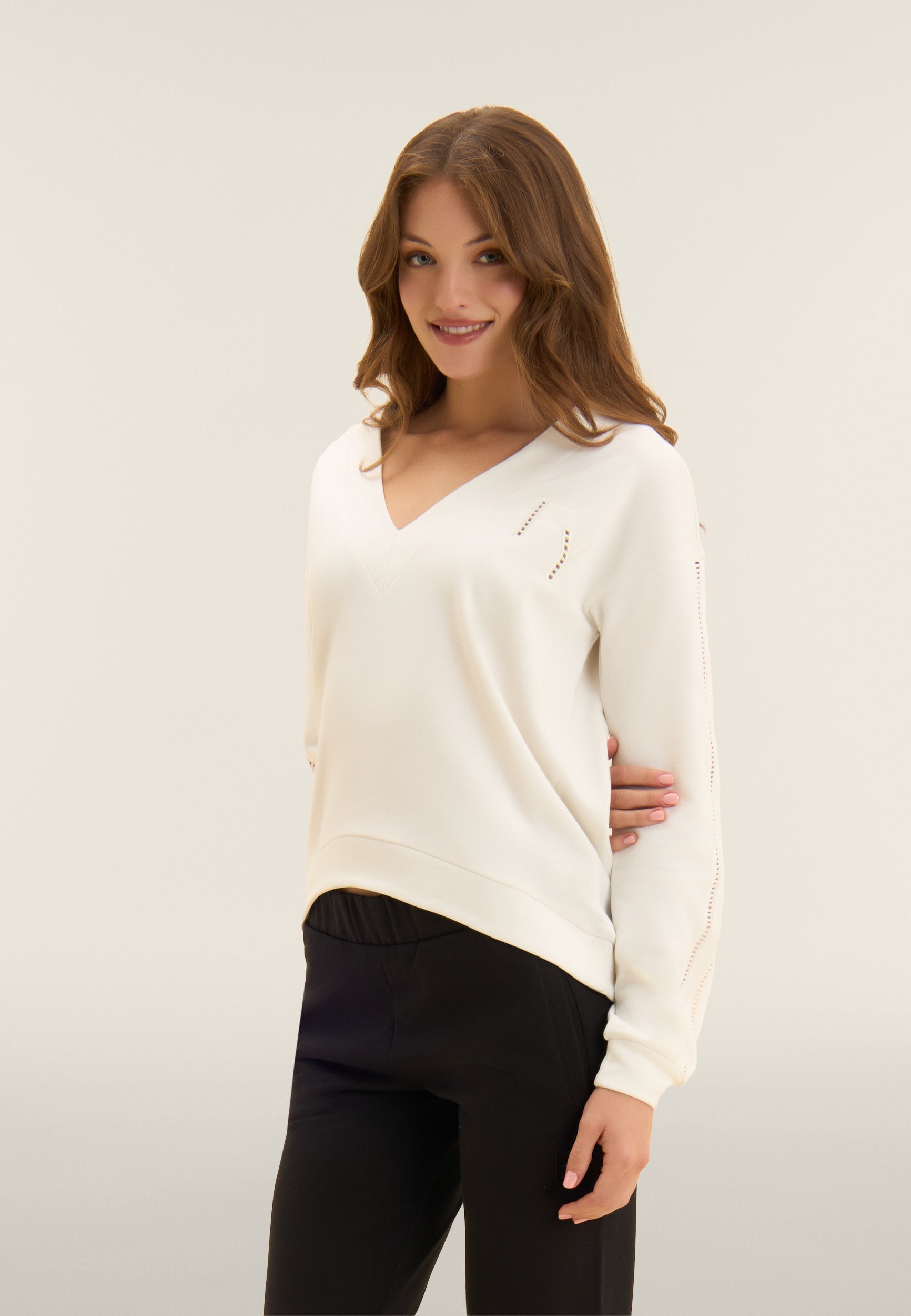 V-neck sweatshirt with dropped shoulder and embroidered details - Egret White