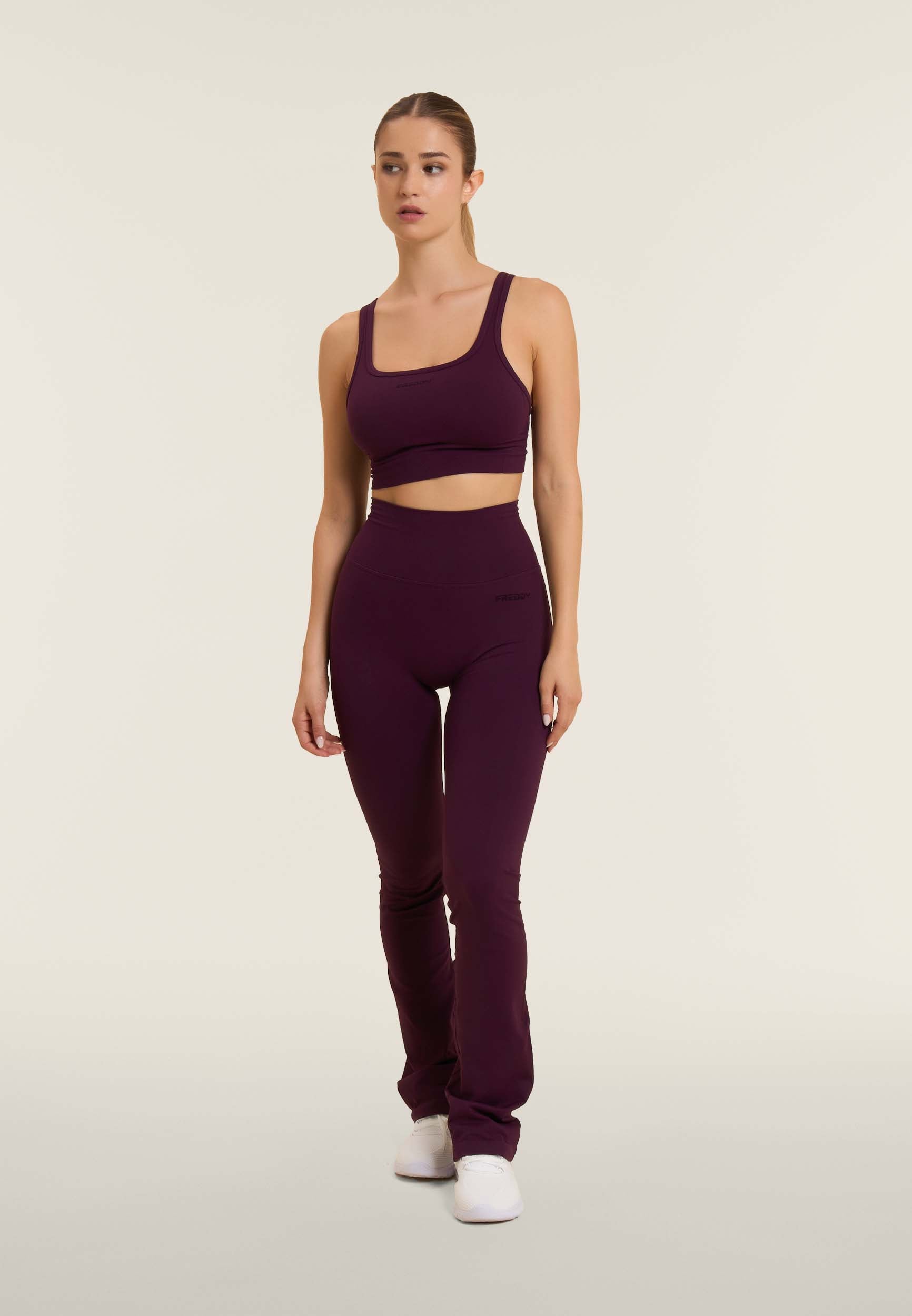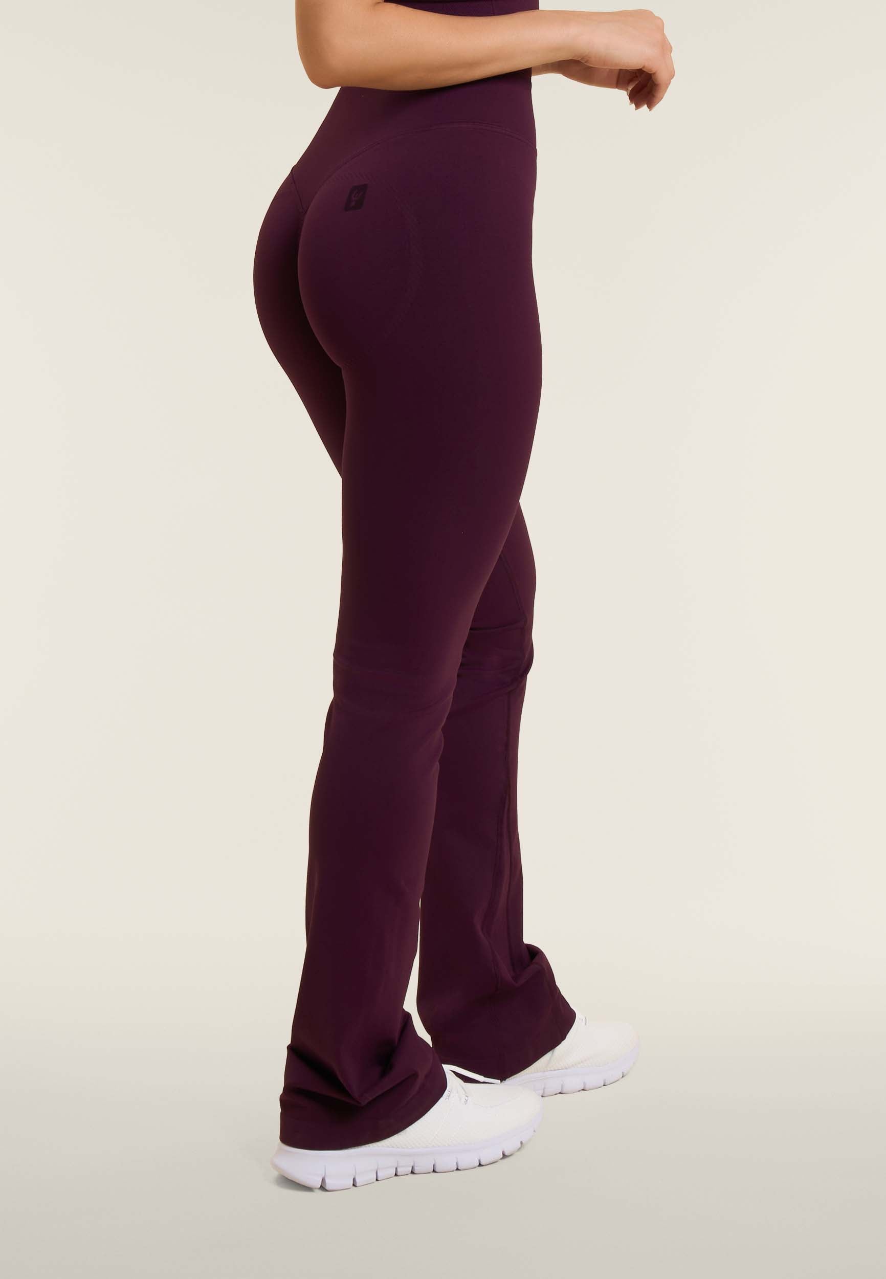 Feminine and modern in style, these regular leggings with flared bottoms are made from breathable jersey fabric for comfort and performance. The very high waist in seamless ribbed fabric gives support, while the heart-shaped seams at the back provide a shaping fit.